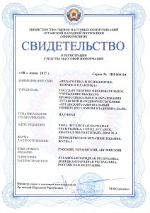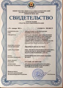 «ПЕДАГОГИКА И ПСИХОЛОГИЯ: ТЕОРИЯ И ПРАКТИКА» — междисциплинарный научный журнал, зарегистрированный в Министерстве связи и массовых коммуникаций Луганской Народной Республики и рекомендуемый для опубликования статей по актуальным проблемам педагогической и психологической наук, а также основных результатов диссертационных исследований на соискание ученой степени доктора и кандидата наук по специальностям: «Педагогические науки», «Психологические науки».